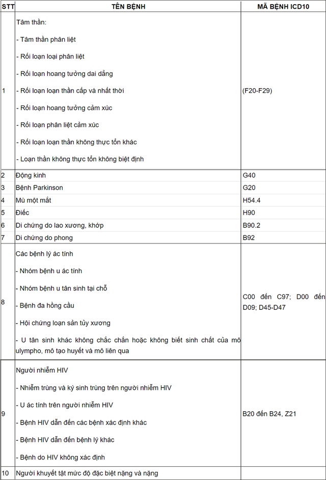 Danh mục các bệnh được miễn nghĩa vụ quân sự năm 2024 là những bệnh thuộc diện miễn đăng ký nghĩa vụ quân sự, không nhận vào quân thường trực. Bao gồm các bệnh như sau:
