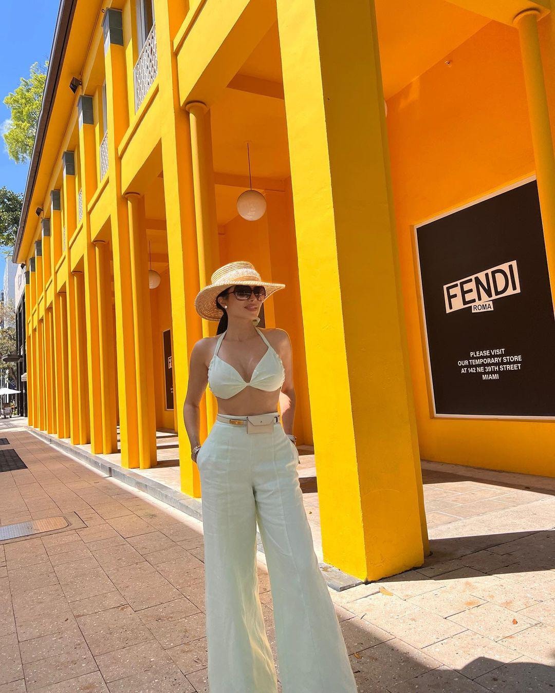 Dự tiệc kỷ niệm ngày cưới của một người bạn năm ngoái, cô phối bộ minidress xanh lá với chiếc túi Stalvey Top Handle 2.0 Mini phiên bản da cá sấu, giá khoảng 12.500 USD (290 triệu đồng). Nhờ được các sao hàng đầu thế giới như Beyoncé, Rihanna, Ariana Grande, Jennifer Lopez, Kylie Jenner, Selena Gomez, Gigi Hadid, Kaia Gerber, Naomi Campbell... liên tục lăng xê, chiếc túi này nhanh chóng trở thành một biểu tượng mới của hội nhà giàu và IT girls (các cô gái trẻ sành điệu).
